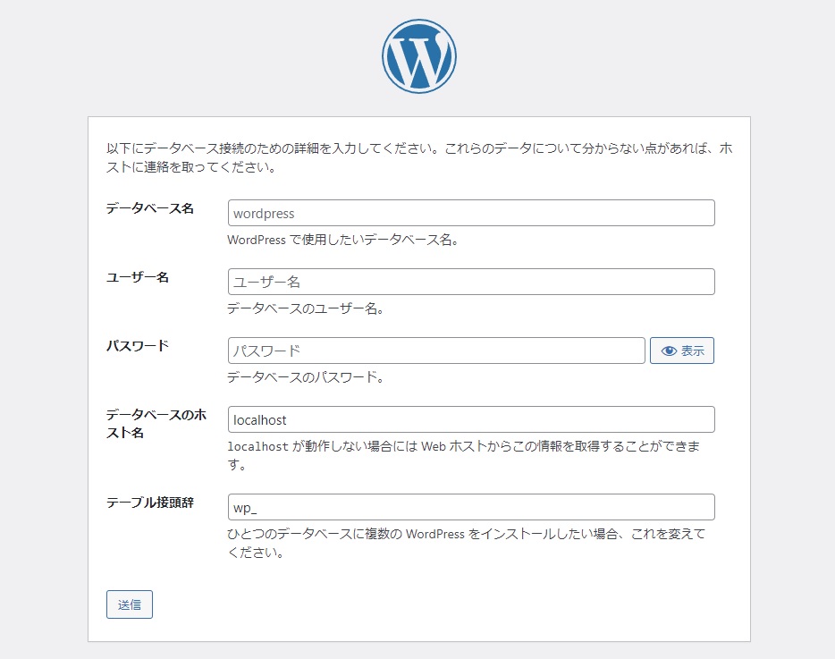 データベースの設定のところで作成したデータベース名、ユーザー名、パスワードをそれぞれ入力します。
